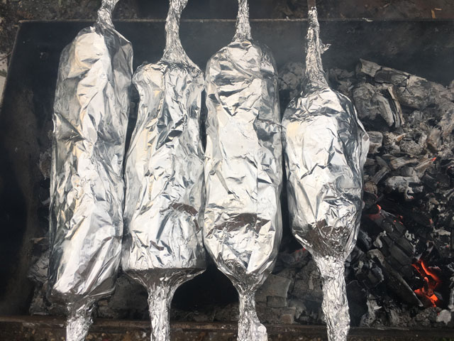• Изредка поворачивая, дадим картофелю хорошо пропечься минут 50-60. Затем осторожно снимаем фольгу. Потому как вырвется пар как только начнете разворачивать фольгу. Убираем фольгу в сторону, а шампуры снова кладем на мангал. Запечем до золотистой корочки картофель.