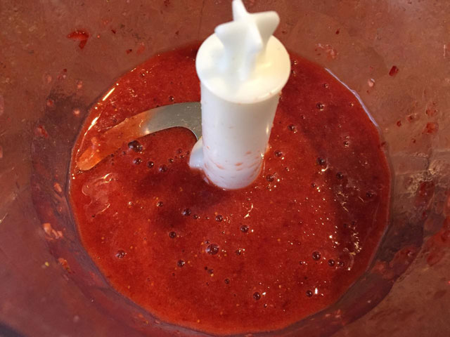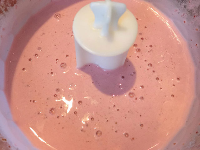 - Снова переливаем клубничное пюре в блендер и взбиваем до пены и осветления массы. Объем увеличится вдвое.