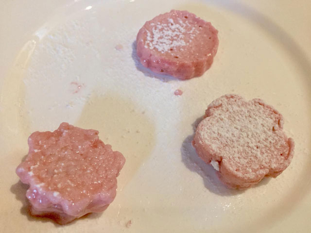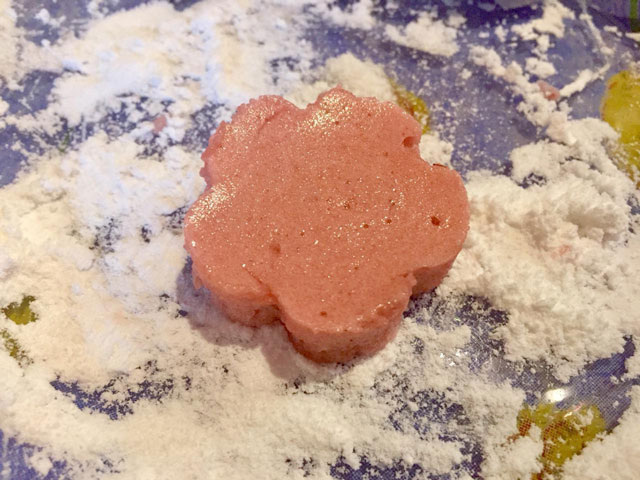 - Через 2 час достаем формочки из холодильника. На плоскую тарелку высыпаем оставшуюся сахарную пудру.
