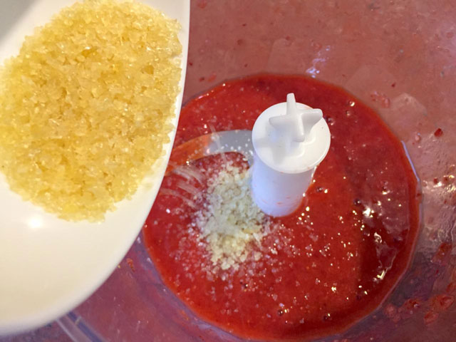 - Когда желатин набух, добавляем в клубнику 100 г сахарной пудры и сок ½ лимона (в тот момент лимона у меня не оказалось и я заменила его лимонной кислотой, буквально на кончике ножа), перемешиваем.
