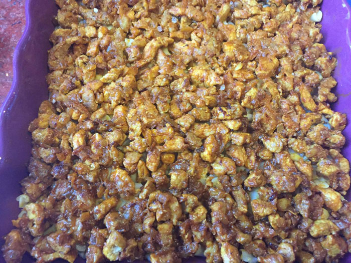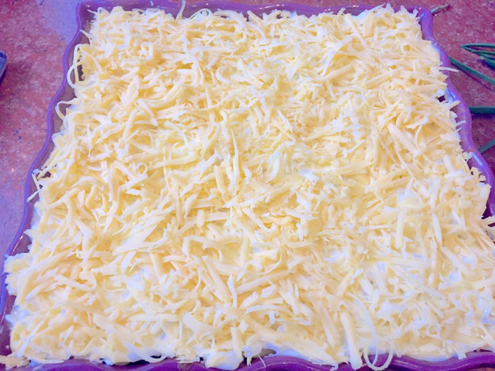 - Пятый слой – посыпаем соус натертым сыром.
