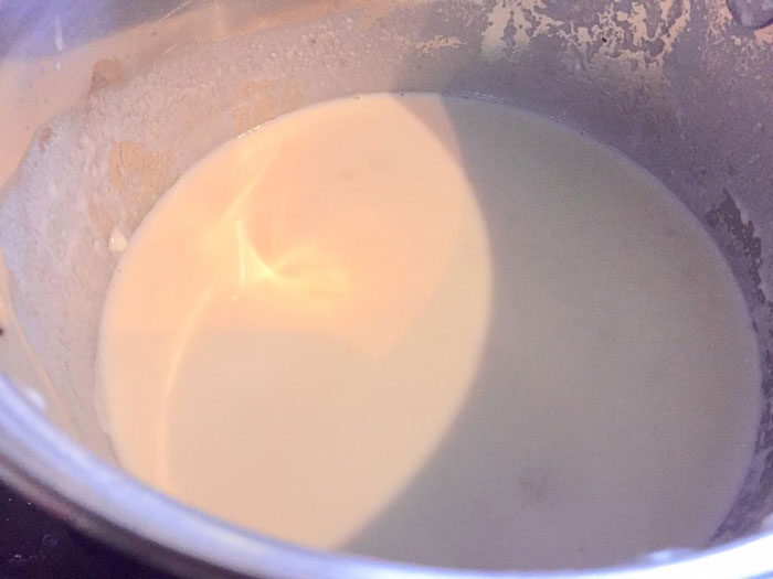 - Всю муку смешали со сливочным маслом, смесь станет густой. Теперь так же небольшими порциями вливаем в муку с маслом молоко. Опять же постоянно перемешиваем. Влили, хорошо перемешали. Наш соус готов. Натираем сыр на крупной терке.