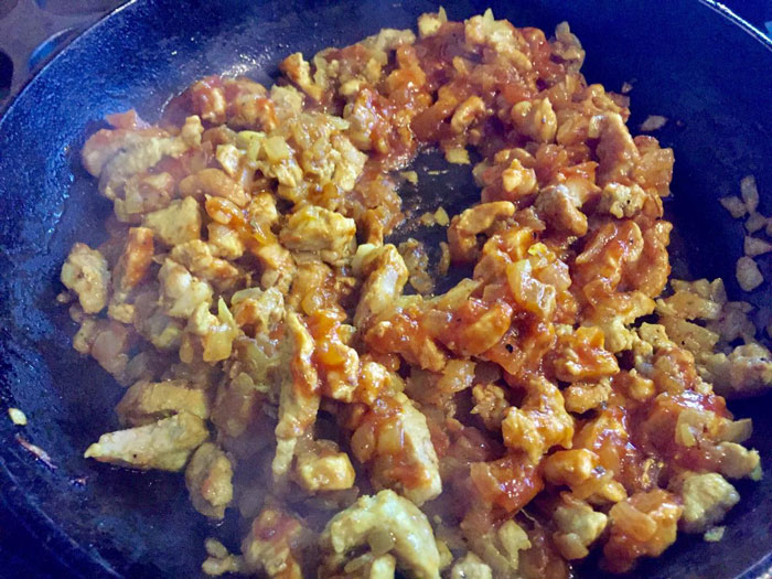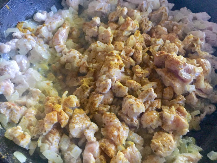 - Выкладываем нарезанное мясо к луку, перемешиваем. Обжариваем. К мясу добавляем специи: соль, черный перец, куркуму (для более аппетитного цвета),