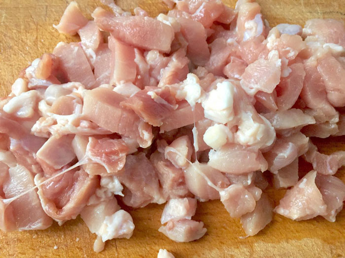 - Пока лук размягчается, мелко нарежем мясо.