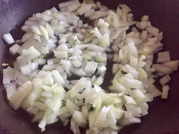 - Ставим сковороду на огонь, наливаем в нее растительное масло (1 ст.л.), разогреваем сковороду. Чистим лук и нарезаем его кубиками. Отправляем нарезанный лук в сковороду. Обжариваем пару минут, чтоб лук размягчился и станет полупрозрачным.