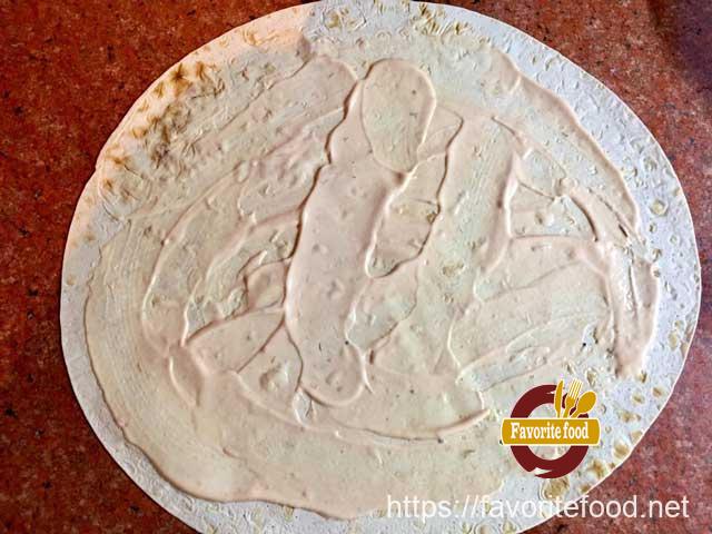 Раскладываем тонкий лаваш. - Смазываем тонкий лаваш «кетчунезом».