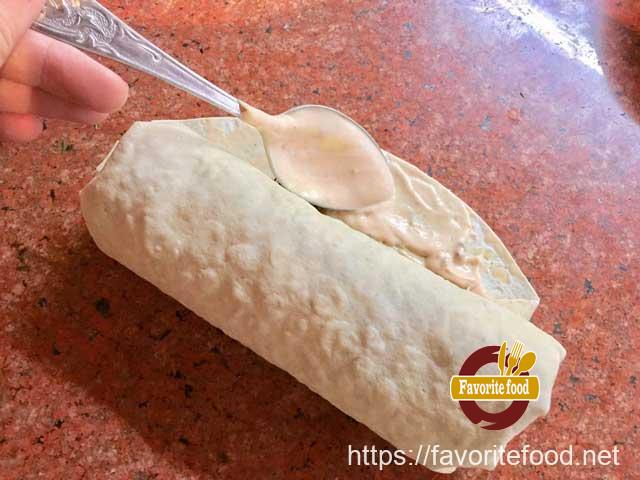 - Оставшийся край лаваша смазываем «кутчунезом», он склеит край и не даст распуститься нашему рулету
