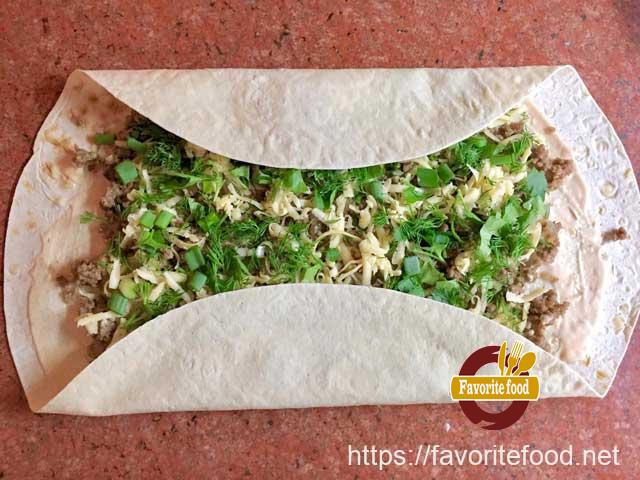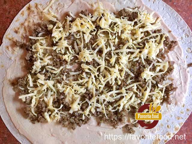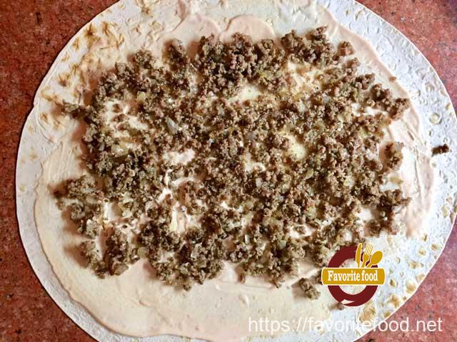 - В середину выкладываем порцию фарша, распределяем равномерно по лавашу тонким слоем, оставляя края лаваша не заполненными. В процессе скручивания лаваша, начинка сдвинется и перераспределится.