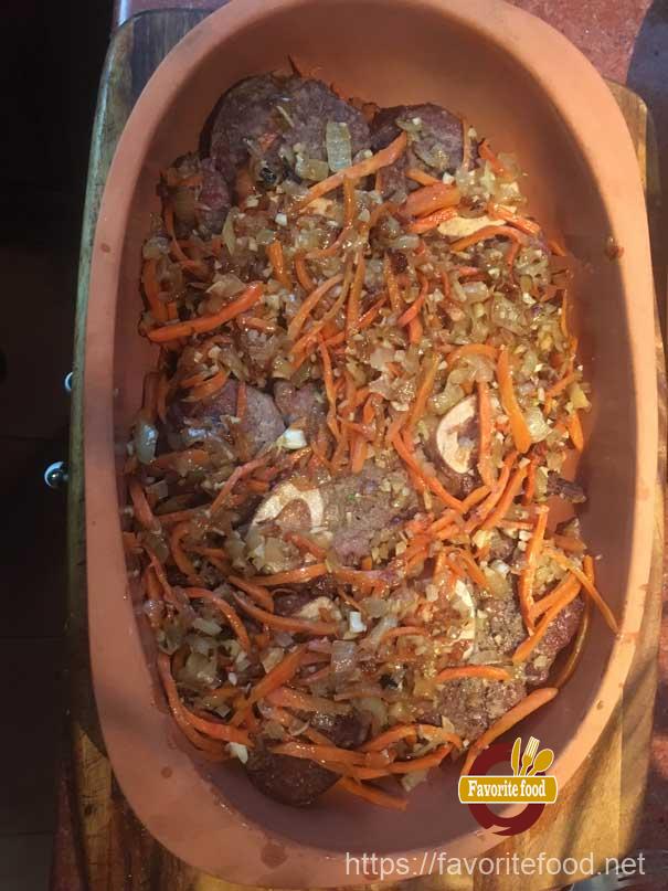 - На мясо, выкладываем обжаренные овощи.
