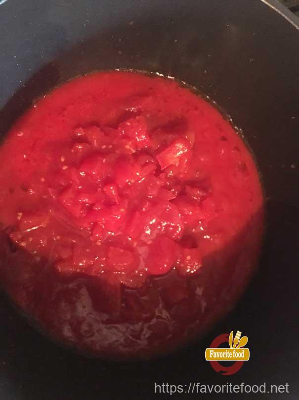 - И все заливаем томатным соусом, который мы приготовили из томатов. Туда же ложим веточки петрушки, тимьяна, лавровый лист и душистый перец.