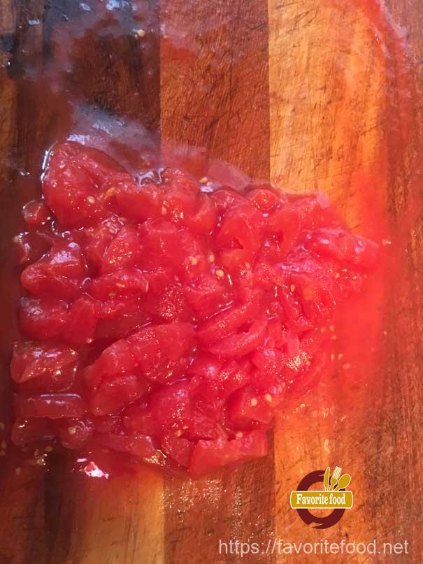 - Если, вы используете сельдерей то нашинкуйте его тоже кубиками. Помидоры надо будет ошпарить, и снять с них шкурку. А потом тоже порезать на кубики. Томаты в собственно соку , обычно уже очищены от кожицы, их достаем из банки и нарезаем на кубики.