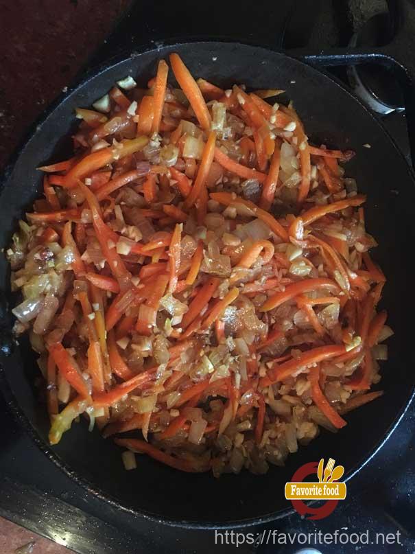Обжариваем , до мягкости моркови. Отодвигаем сковороду в сторону.