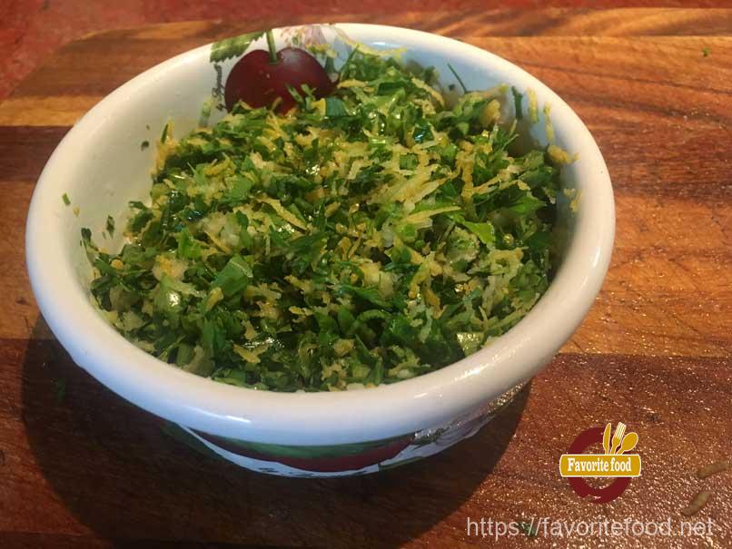 Сверху посыпаем гремолатой, она придает такую свежесть блюду.