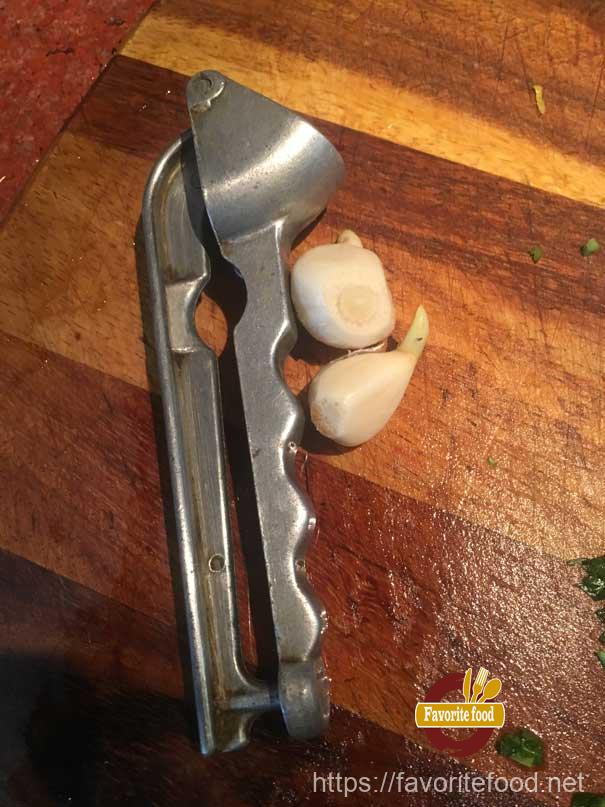 - Чистим чеснок, и выдавливаем его в нашу цедру.