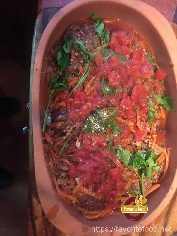 - Минут за пять, до готовности мяса, достаем наше блюдо открываем крышку и посыпаем частью гремолаты. Закрываем снова крышкой и отправляем снова в духовку на пять минут. Вот и прошли долгожданные пять минут. Можно доставать ..