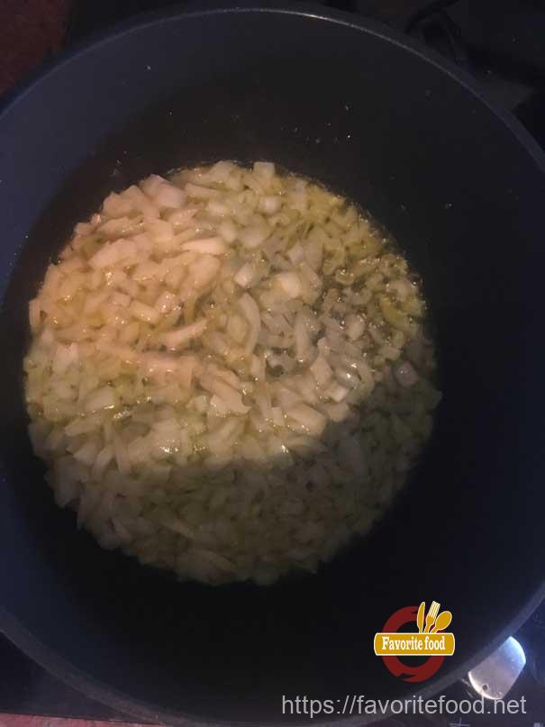 - Обжариваем его до золотистой, красивой корочки.Затем в этой же сковороде, где обжаривали мясо, обжарим лук. Тоже до красивого золотистого цвета.