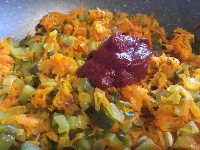 • К нашей зажарке добавляем томатную пасту и 3-4 столовые ложки кипящего бульона или огуречного рассола (это кому как нравится). Перемешиваем и тушим еще 5 минут. Измельчаем кориандр и черный перец в ступке (если они в зернах) и добавляем специи к нашей зажарке. Перемешиваем. Зажарка для рассольника готова. Выключаем огонь.