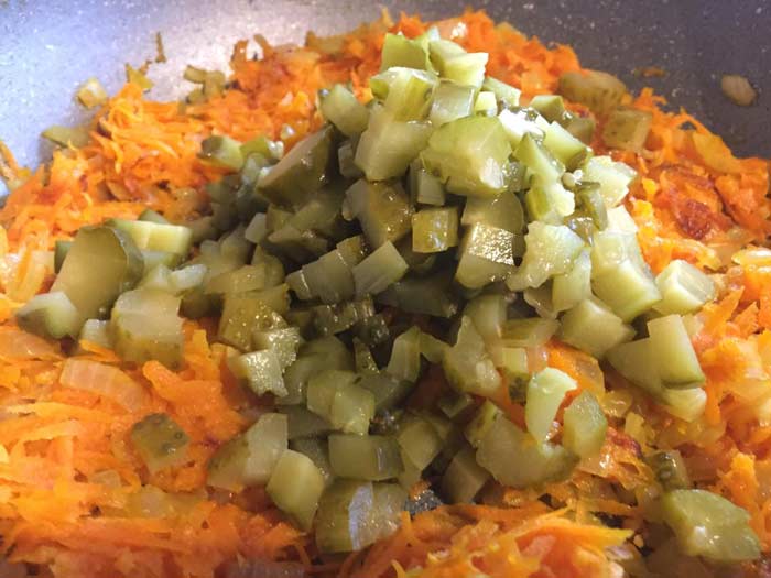 • Нарезаем соленые огурцы кубиками и добавляем к луку с морковью. Перемешиваем.