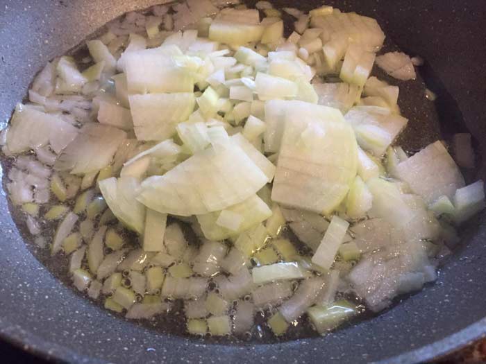 • На сковороду наливаем растительное масло и ставим ее на огонь. Лук чистим, режем его кубиками и отправляем в разогретую сковороду. Обжариваем пару минут.
