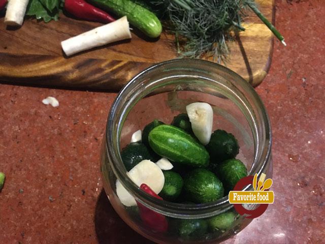 - Кладем еще листиков смородины, укропа, зубчики чеснока. И один перчик чили. ( можно конечно и не класть чили, если не любите острое)