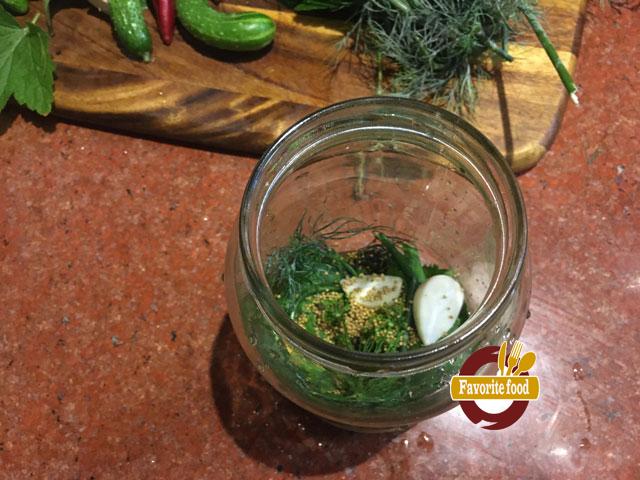 - В чистые, простерилизованные банки закладываем листья хрена, смородины, укроп.