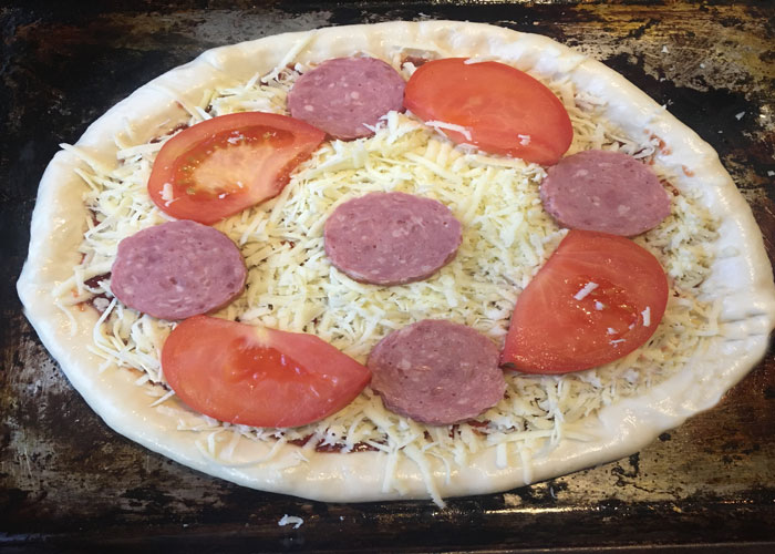 - Затем нарезанную кружочками колбасу. При желании можно добавить все , что вы любите. И сделать такую начинку, чтоб она понравилась Вашей семье или друзьям.