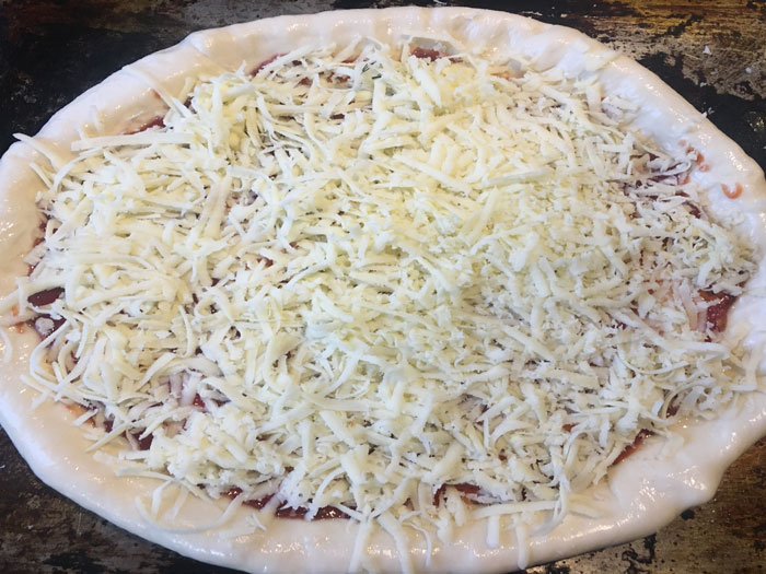 - Смазываем нашу основу соусом, посыпаем все хорошо натертым сыром.