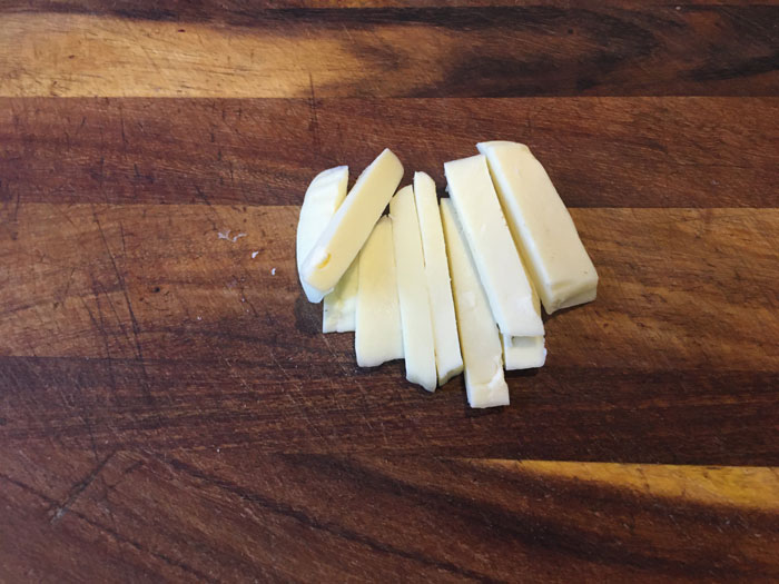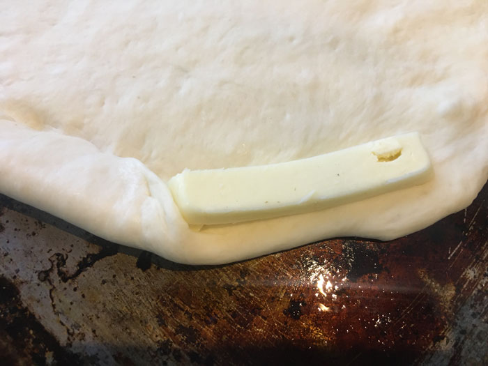 - Вот теперь, брусочки сыра мы разложим по краю основу и закроем их краем, хорошо залепив тесто. Это и будет главной фишкой нашей пиццы.