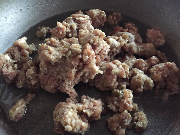 • Разогреваем сковороду, вливаем в нее растительное масло и обжариваем фарш, минут 5-7. Фарш берите любой, какой Вам по душе. Лук чистим, нарезаем его мелко и отправляем к фаршу. Туда же выдавливаем через чеснокодавку или мелко нарубленные почищенные зубчики чеснока. Перемешиваем и жарим фарш до готовности. Это примерно 10 минут.