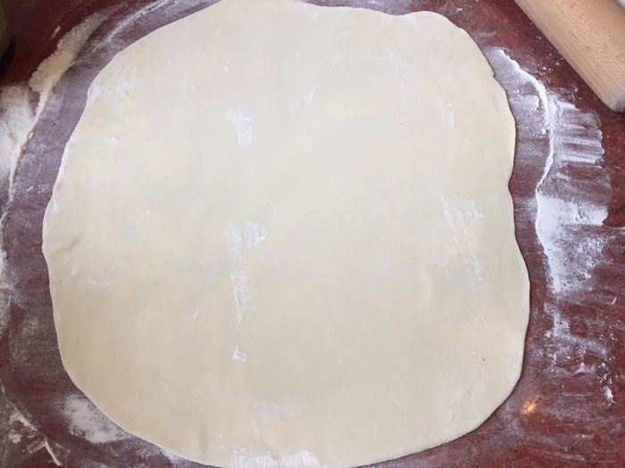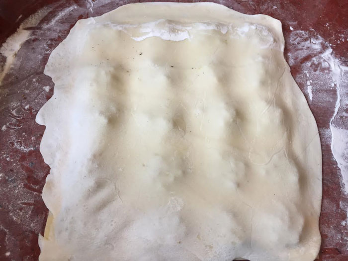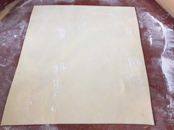 • Лучше стараться придать тесту прямоугольную форму, но, если это не получается, не беда, просто обрежьте края кухонным ножом или ножом для пиццы. Лучше раскатать сразу и вторую половину теста – это упростит готовку.