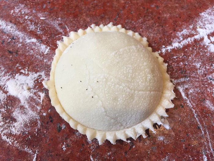 • Кисточкой смазываем тесто вокруг начинки, так слои теста лучше склеятся при соединении пластов.