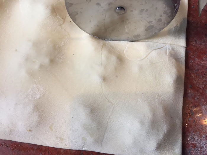 • Дальше есть два варианта, решать вам как удобнее. 1 – разрезаем тесто ножом для пиццы или специальным роликом на квадраты, между начинкой.