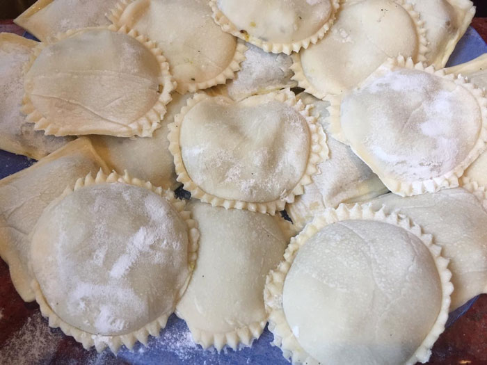 • Все равиоли нарезаны, выкладываем их на полотенце или плоскую тарелку большого диаметра, чтоб они не слиплись и оставляем подветриться минут на 30.
