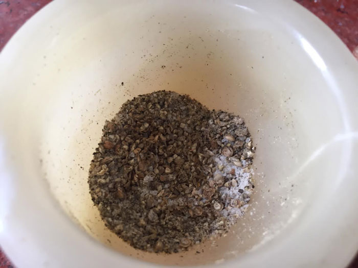 • Пока фарш обжаривается, готовим смесь специй. Если специи молотые, то просто перемешайте их, если нет, то измельчаем их в ступке (мне так больше нравится, аромат более насыщенный получается), а мускатный орех натираем на мелкой терке.