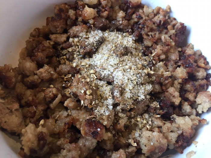 • Готовый фарш снимаем с огня, добавляем в него смесь специй и соль. Перемешиваем.