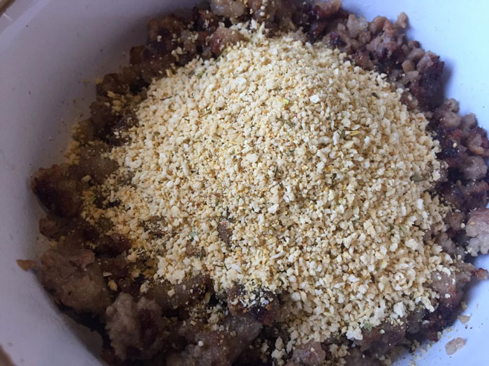 • Дальше всыпаем в фарш измельченные сухари. Перемешиваем.