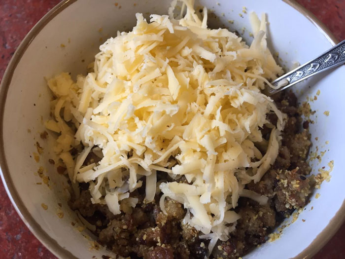 • Даем фаршу немного остыть, минут 5, не больше, чтоб можно было добавить в него сыр и сыр не расплавился раньше времени. Добавляем натертый сыр. Перемешиваем. Начинка для равиоли готова.