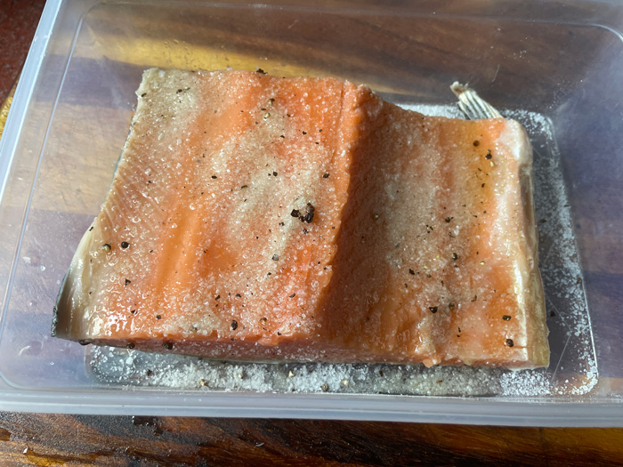 - Смешиваем соль и сахар. Укладываем рыбу в контейнер, пересыпаю соленной смесью. Сверху поливаем коньяком. И убираем в холодильник. На 2-3 дня. Но не забываем переворачивать куски рыбы, чтобы рыба равномерно просаливалась. По истечении времени , рыбу достаем , промываем под проточной водой от излишков соли, обсушиваем бумажными полотенцами и рыба готова.