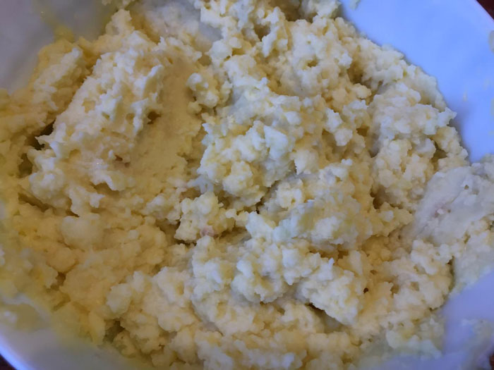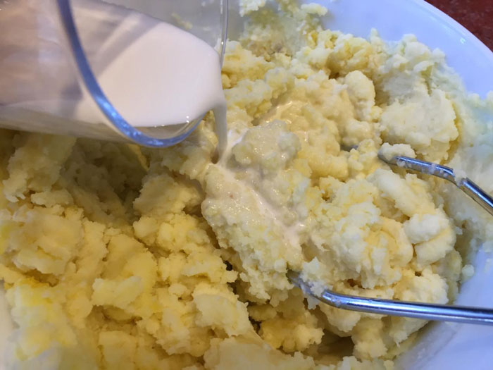 - В пюре влейте молоко и продолжайте разминать его при помощи толкушки. Использовать блендер я бы не советовала, поскольку в нем получится клейкая каша – совсем не та консистенция, что нам нужна.