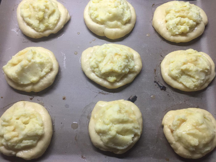 - Раскладываем картофельную начинку в получившиеся углубления в тесте.