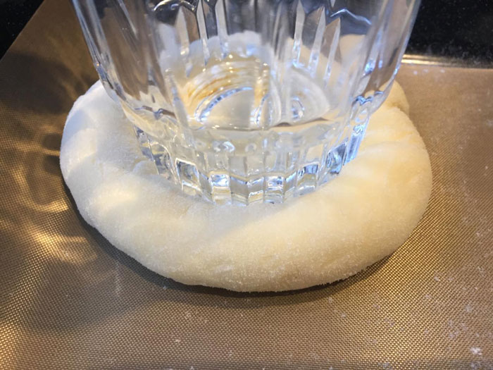 - Любым стаканом с плоским дном делаем углубление в шарике из теста. Но не переусердствуйте с силой нажатия, чтоб не продавить тесто насквозь.