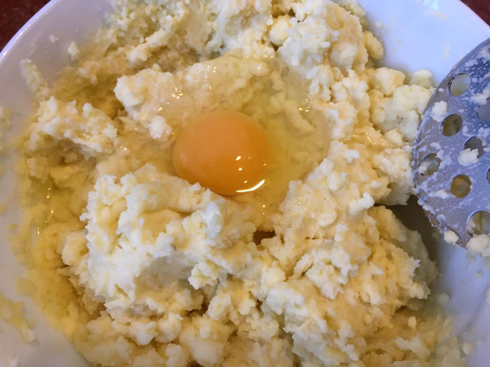 - Далее в пюре разбиваем 1 яйцо и добавляем 40 г сливочного масла. Перемешиваем. Начинка для шанежек готова.