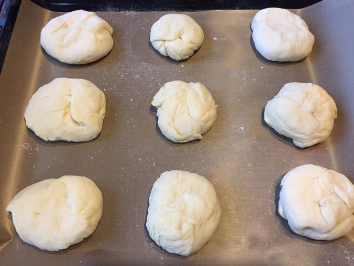 - Дрожжевое тесто делим на равные шарики и выкладываем их на противень, смазанный растительным маслом или покрытый бумагой для выпечки. Шарики из теста раскладывайте не вплотную, а на расстоянии друг от друга.