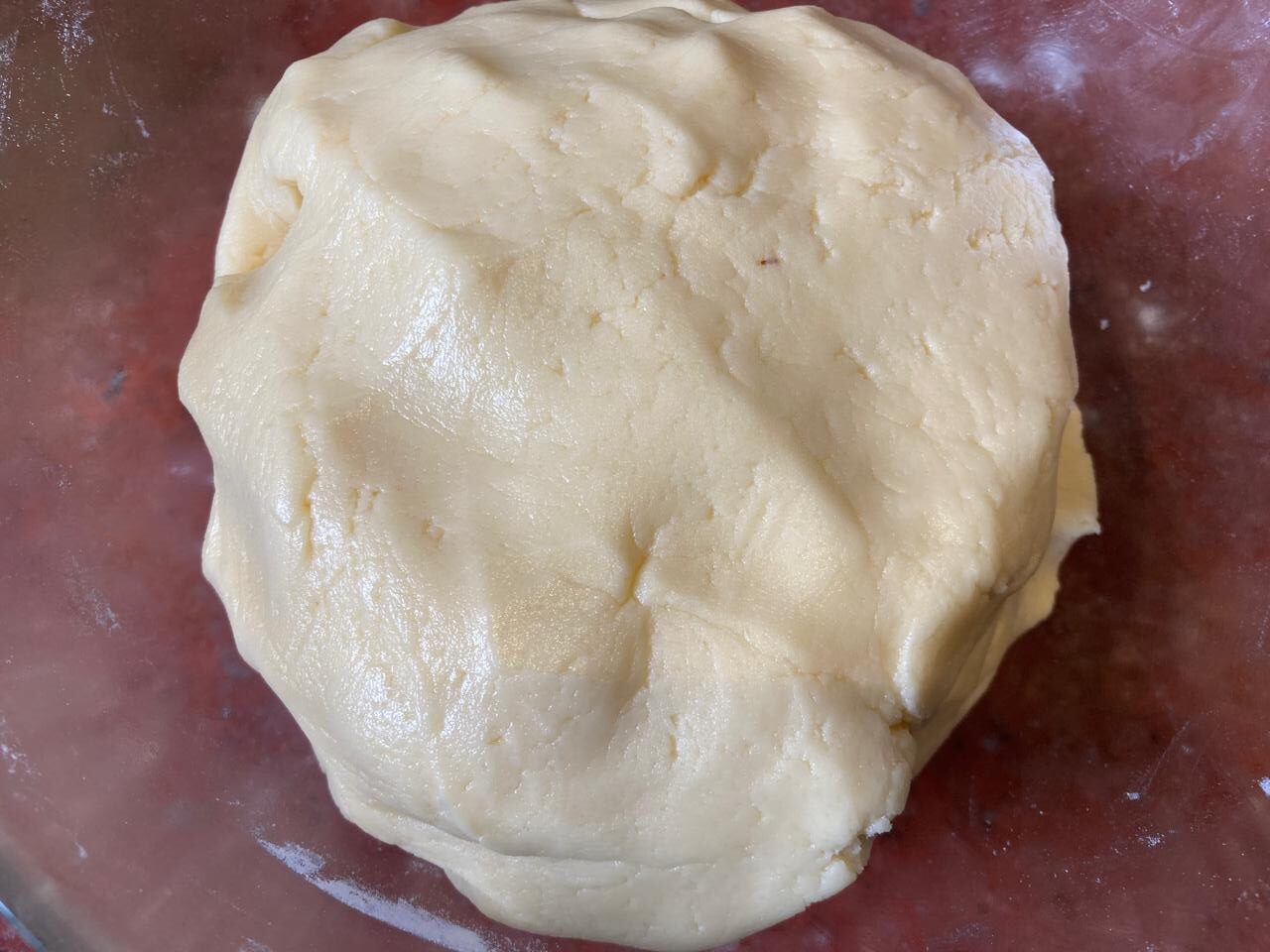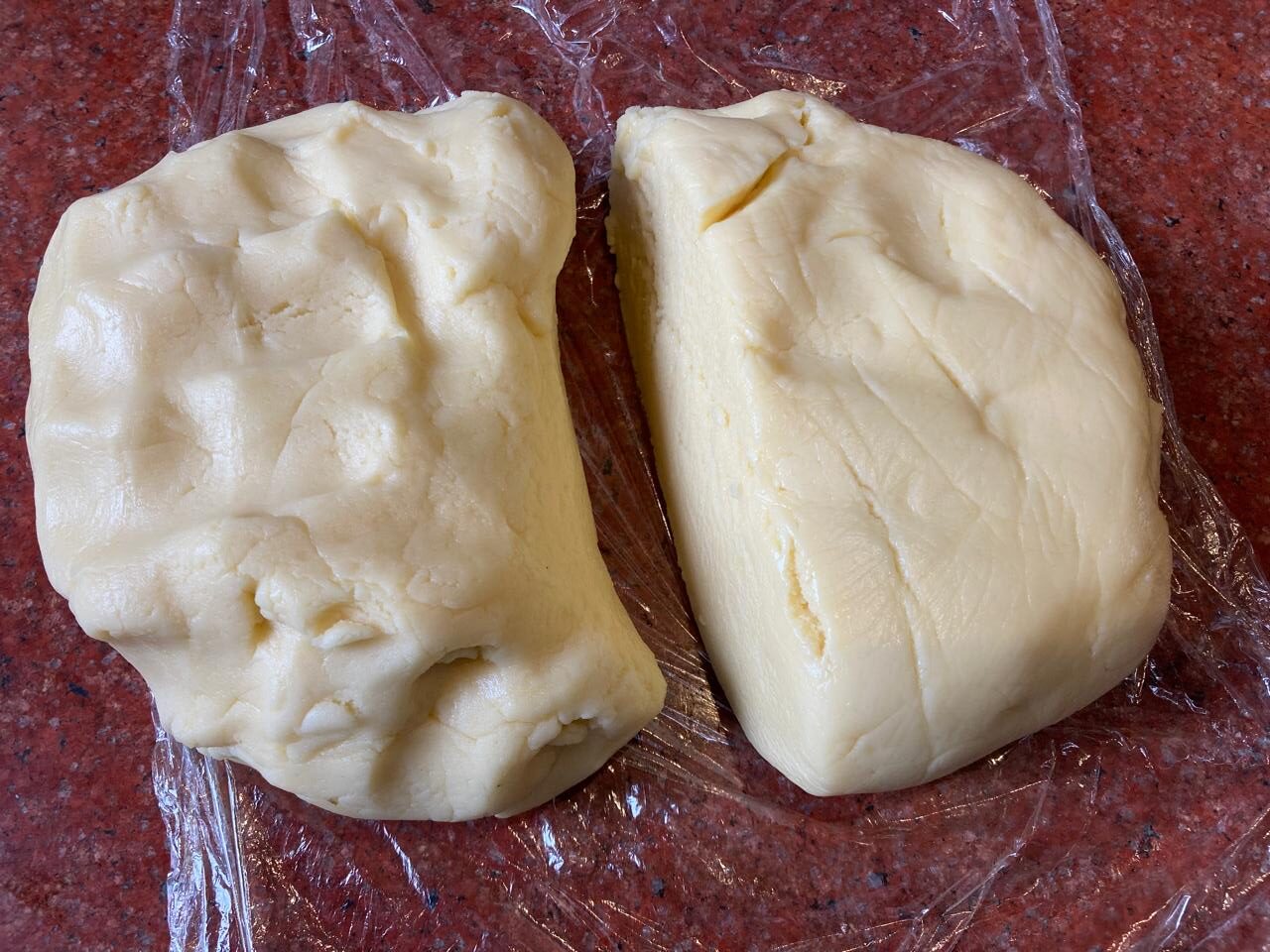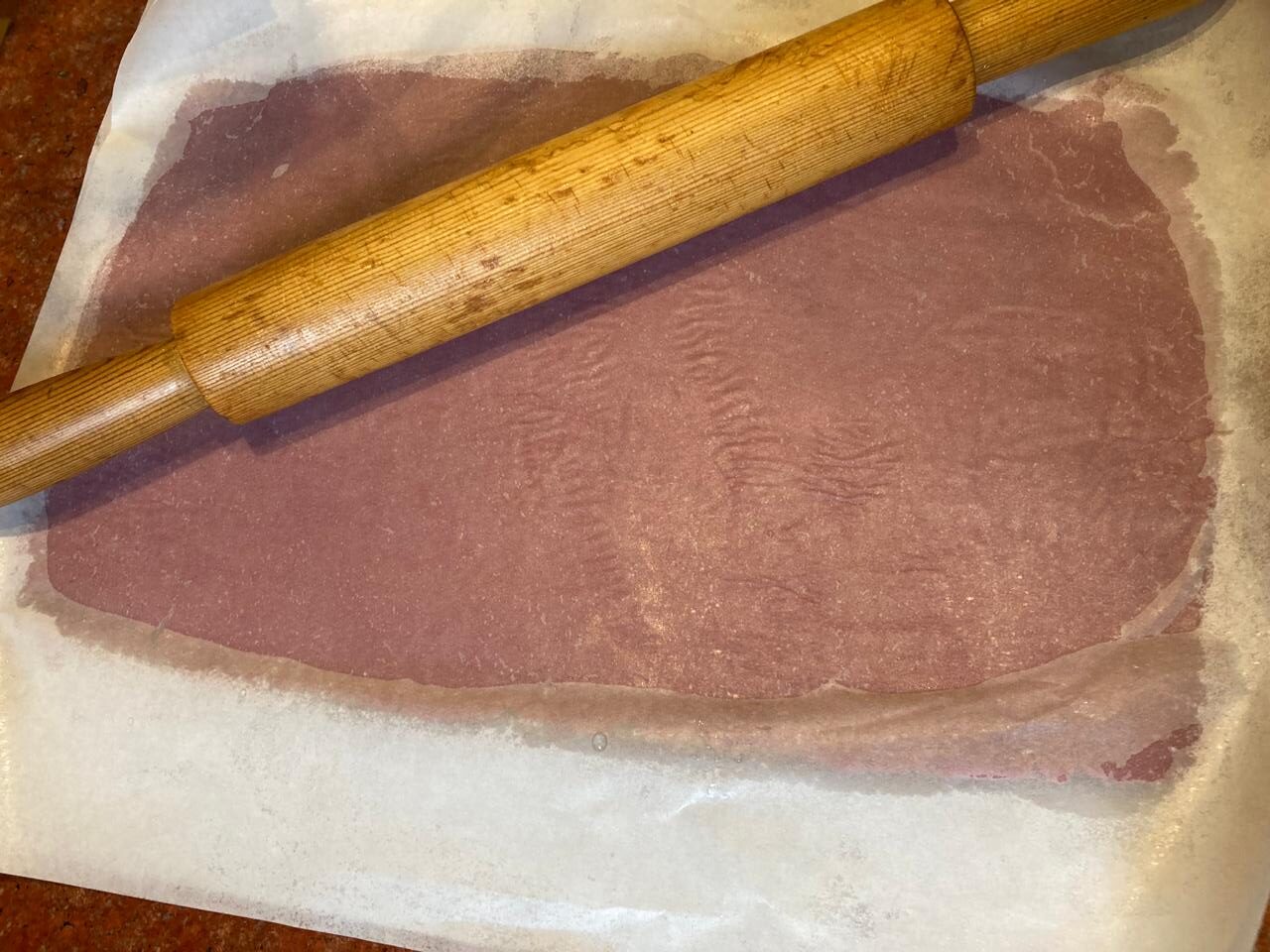 - После охлаждения, тесто складываем один пласт на другой. Прокатываем скалкой по верхнему слою теста, без сильных нажатий. Прокатываем просто для склеивания двух пластов теста.
