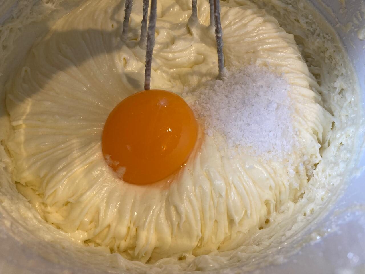 - Пока сахар вмешивается в масляно-сырную смесь, отделяем желток куриного яйца от белка и когда сахар уже разошелся, добавляем желток плюс соль в чашу миксера к масляной смеси. Продолжаем вымешивать смесь.