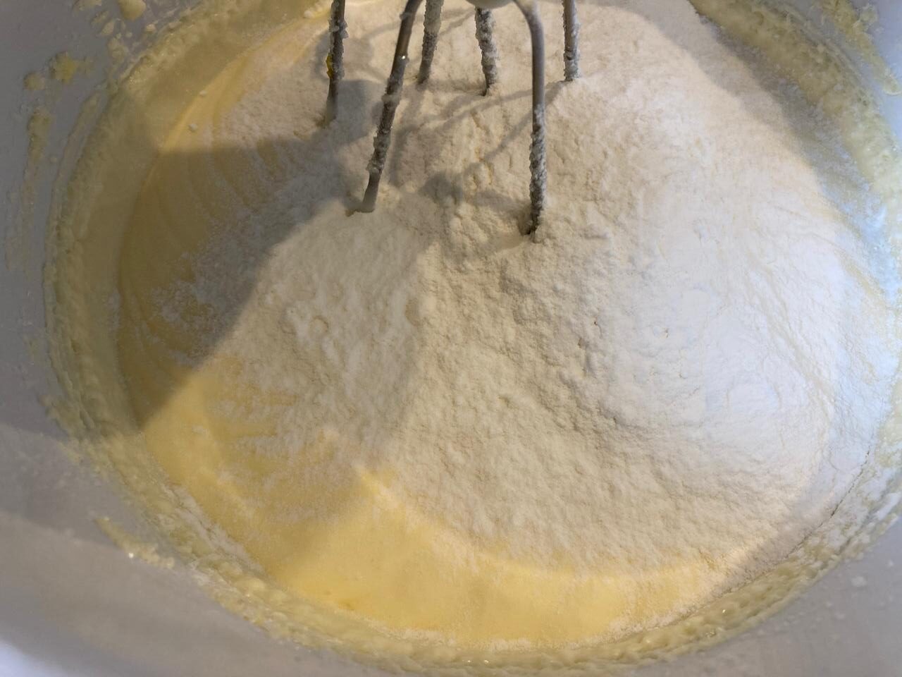 - Смесь стала однородной, время добавлять муку, небольшими порциями. Скорость миксера лучше снизить, чтоб мука не разлеталась.