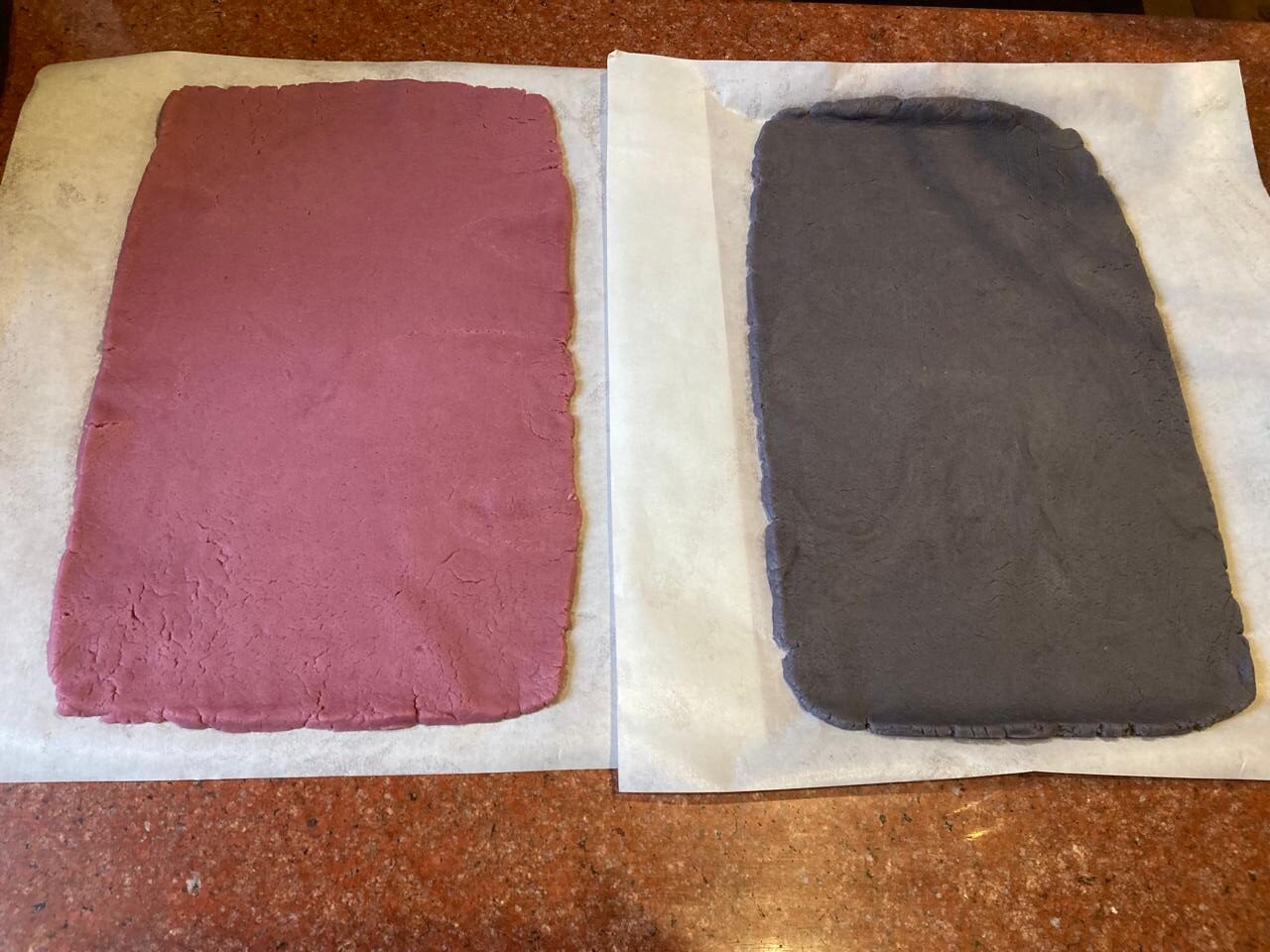 - Вымешиваем тесто с красителем до получения ровного цвета, желательно это делать в перчатках, чтоб не отмывать потом руки от краски. Но! Можно оставить и не полное прокрашивание, тогда Ваше печенье получится полосатым, тоже неплохо. Получившиеся части теста раскатываем толщиной 4-5 мм, далее, раскатанные пласты нужно охладить в холодильнике 20 минут, чтоб с тестом было проще работать.
