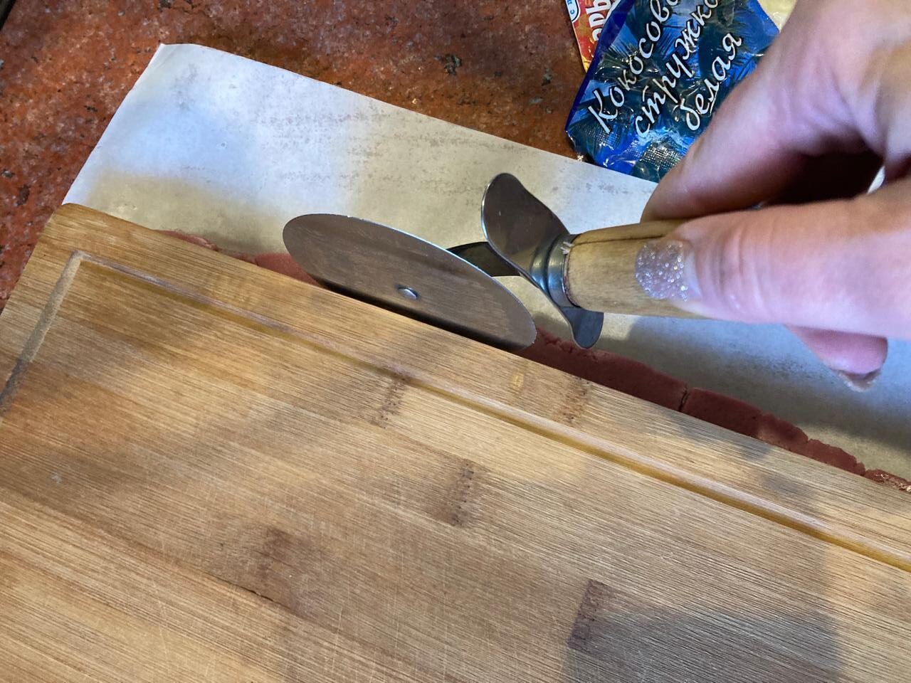 - Поскольку у меня запланированы рождественские тросточки, я следую своему плану и нарезаю тесто ножом для пиццы, мне так удобнее, можно и обычным кухонным ножом, на полоски в 1 см.