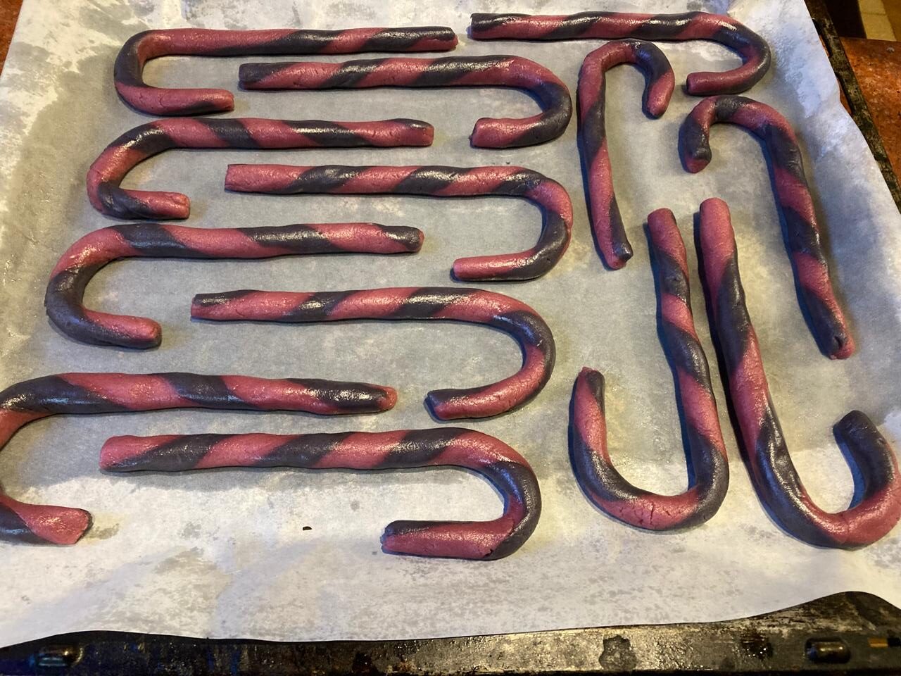 - Придаю форму рождественской тросточки и выкладываю на противень, выстланный бумагой для выпечки, смазанной растительным маслом. Отправляю песочное печенье в разогретую до 180 градусов духовку и запекаю 12-15 минут.