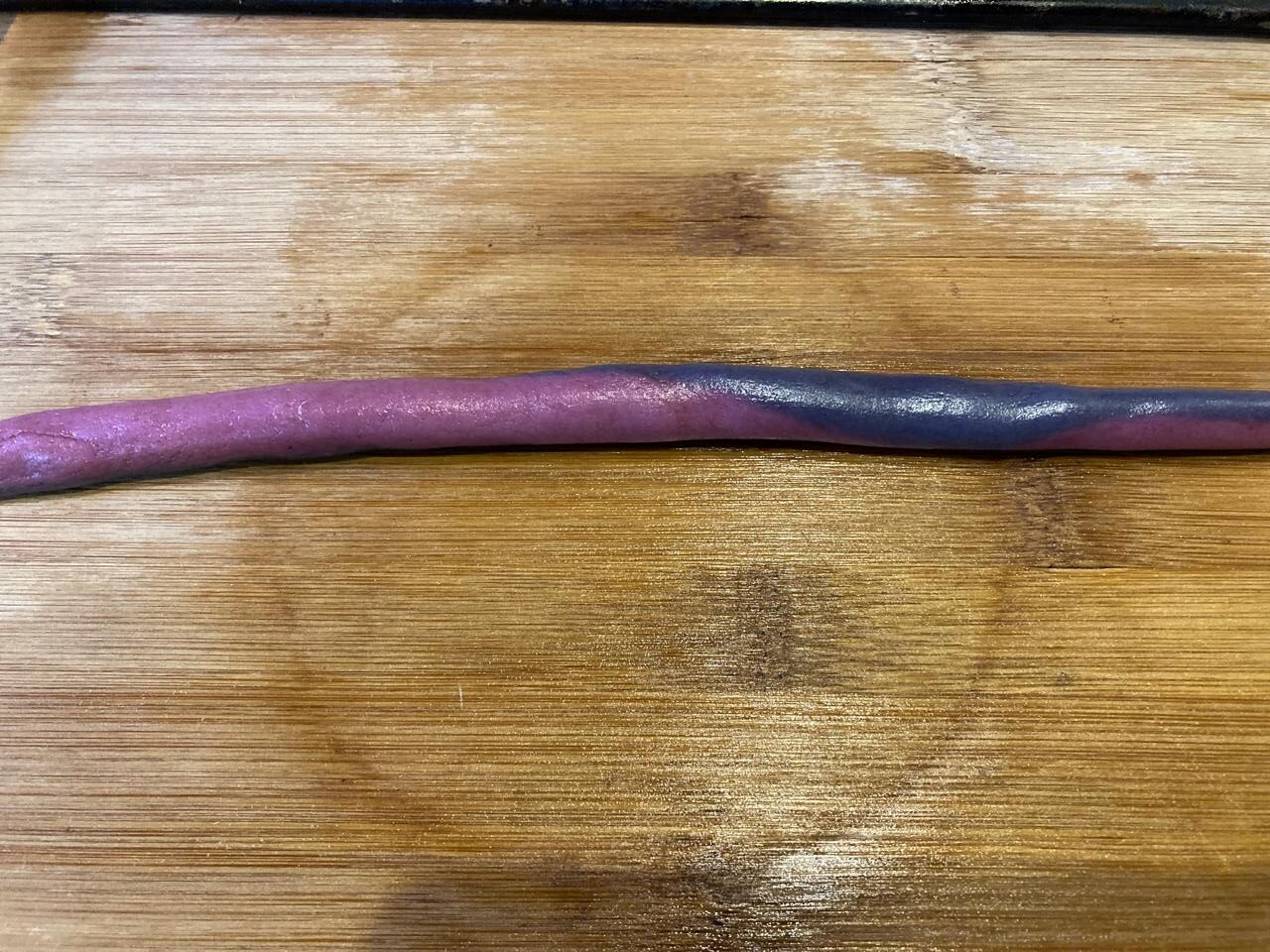 - Дальше отделяю одну полоску, руками слегка прокатываю ее, сглаживая углы, сильно нажимать на колбаску не стоит.